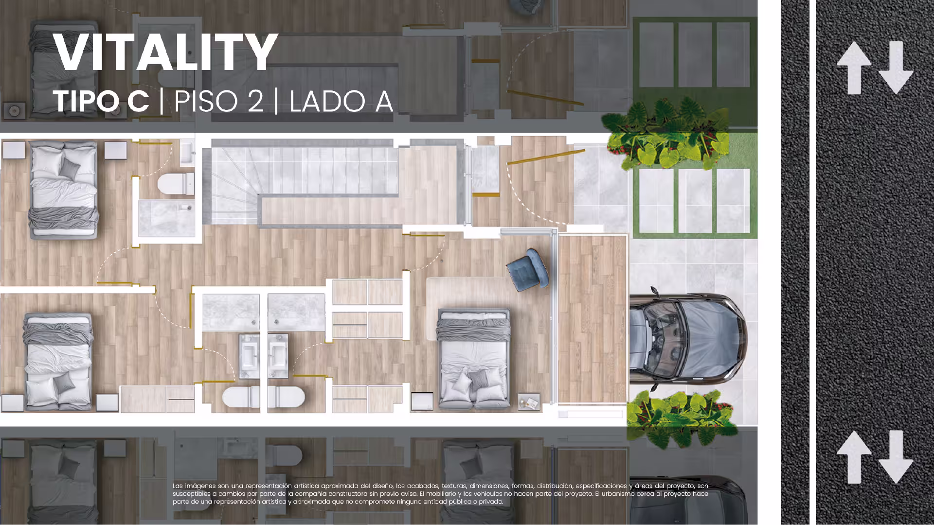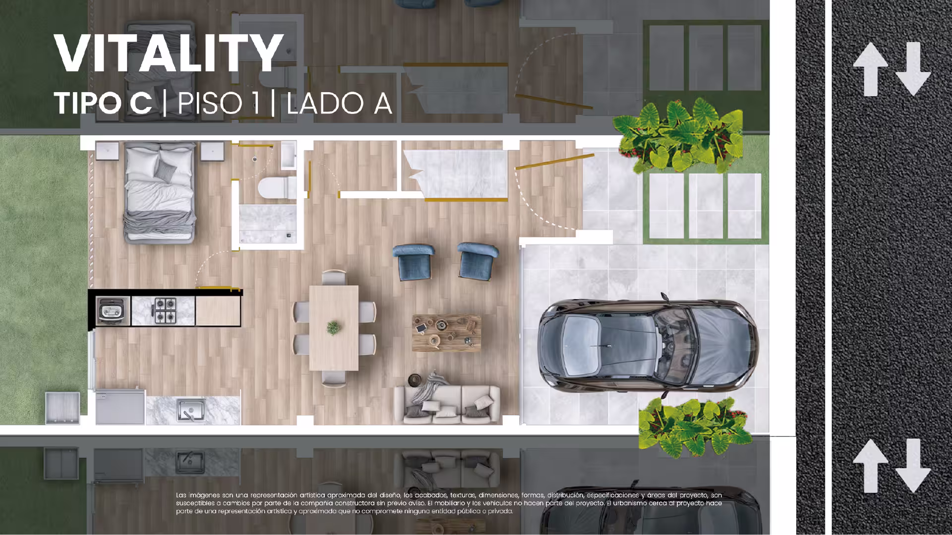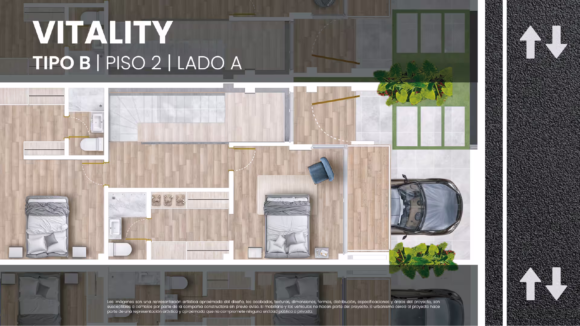 Las imágenes son una representación artística aproximada del diseño, los acabados, texturas, dimensiones, formas, distribución, especificaciones y áreas del proyecto, y son susceptibles a cambios por parte de la compañía constructora sin previo aviso. El mobiliario y los vehículos no hacen parte del proyecto. El urbanismo cerca al proyecto es una representación artística y aproximada que no compromete a ninguna entidad pública o privada.